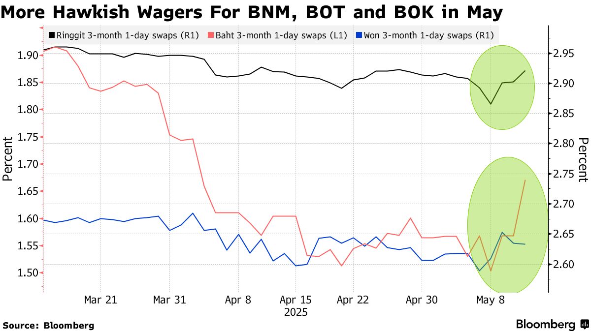 目前利率互換交易員預計泰國央行未來三個月將降息9個基點,而4月底時的預期為近20個基點。馬來西亞和韓國的貨幣寬鬆預期也有所減弱。