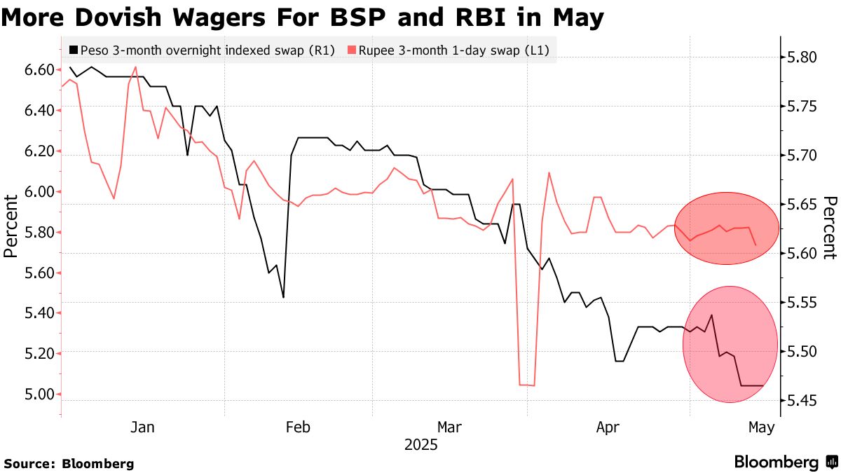 相比之下,中美緊張局勢的緩和並未對該地區出口依賴度較低的國家產生類似影響。菲律賓比索的隔夜指數互換顯示,未來三個月將有4個基點的寬鬆,而4月底時的預測是維持現狀。