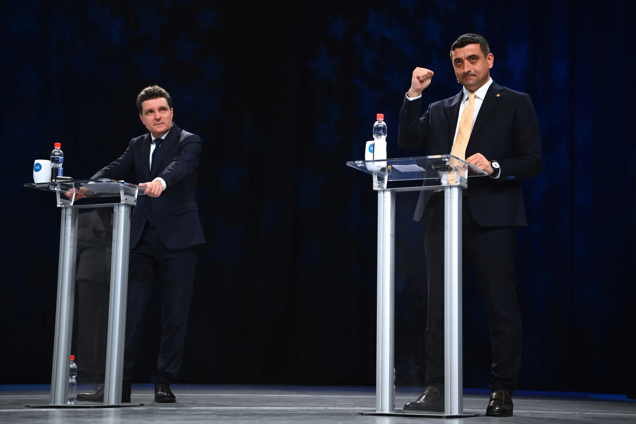 5月8日布加勒斯特選舉辯論會上,左為尼庫索爾·丹,右為喬治·西米翁。