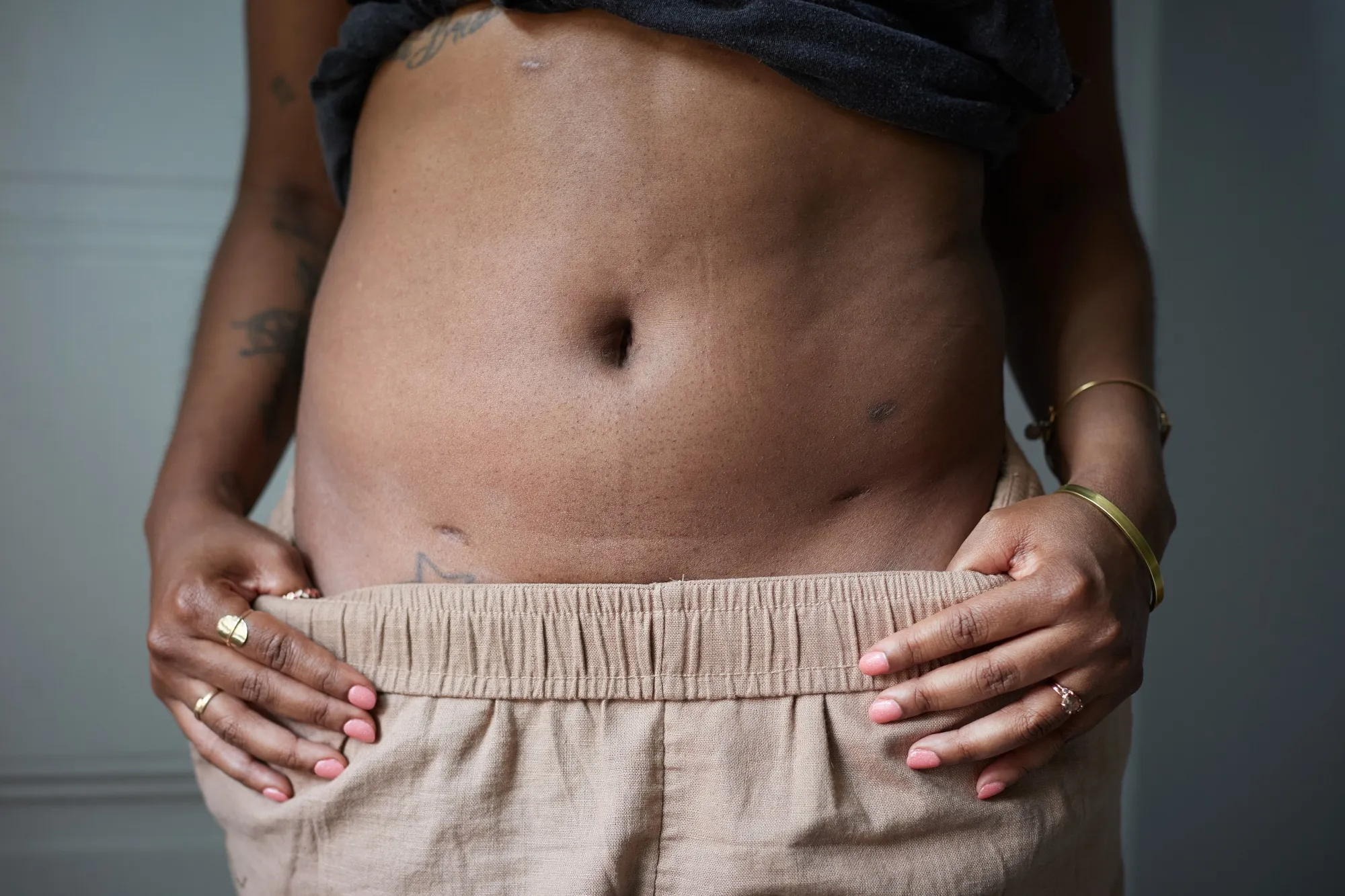 美國賓夕法尼亞州費城,一名女性展示她的腹腔鏡手術疤痕。