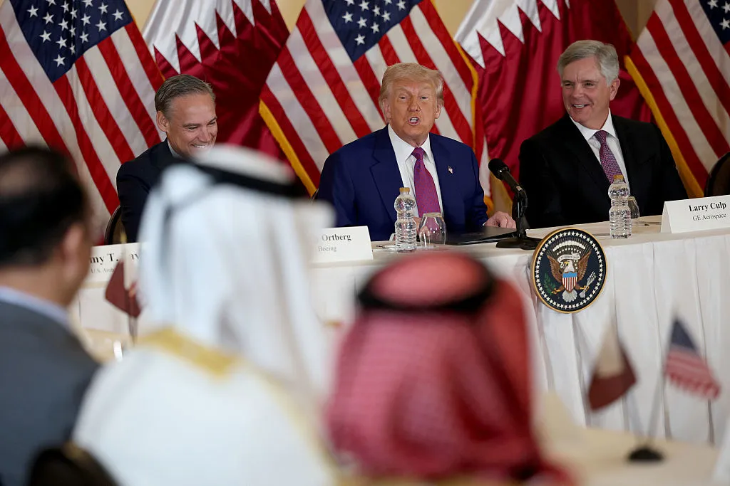 唐納德·特朗普在拉里·卡爾普與凱利·奧特伯格陪同下,於多哈麗思卡爾頓酒店會見商界領袖。來源:蓋蒂圖片社歐洲在多哈,特朗普與波音首席執行官凱利·奧特伯格並肩而坐,與卡塔爾航空簽署商業協議。儘管總統對交易規模和金額不甚明確——在簽約儀式上與奧特伯格反覆確認——但他確信這是這家美國飛機制造商有史以來最大訂單。