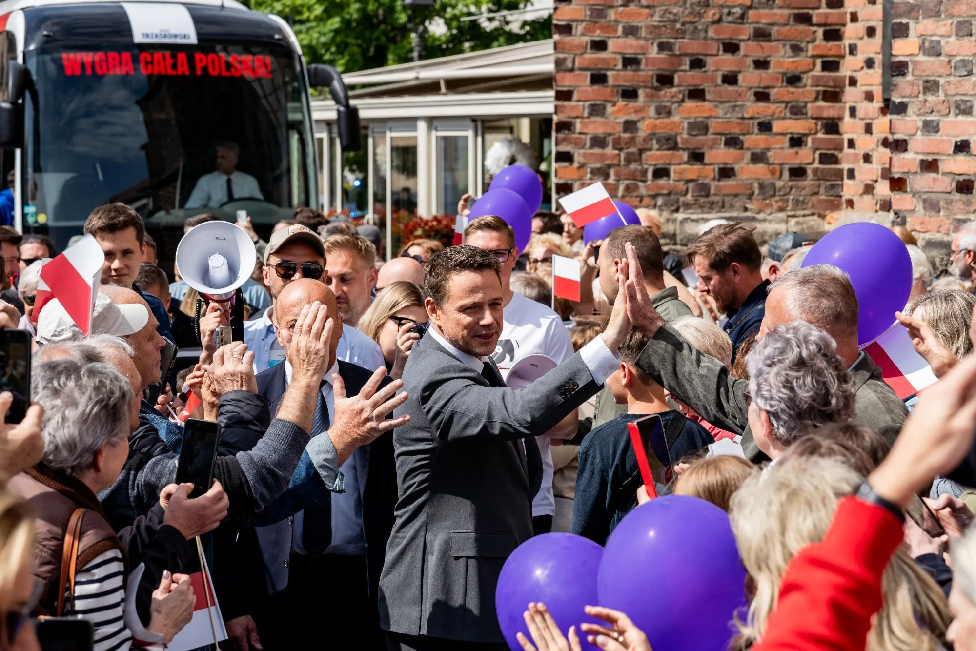 5月14日,拉法爾·特扎斯科夫斯基(中)在波蘭布熱格向支持者致意。攝影師:達米安·萊曼斯基/彭博社民調顯示,在第一輪投票前,圖斯克的盟友、華沙市長拉法爾·特扎斯科夫斯基領先於其主要民粹主義對手、歷史學家卡羅爾·納夫羅茨基。兩人很可能在6月1日的決選中對決。