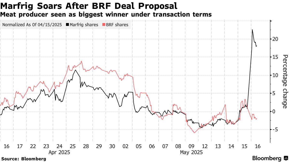 Marfrig(MRFG3 BZ)股價飆升 因BRF收購方案被視為對買方有利——彭博社