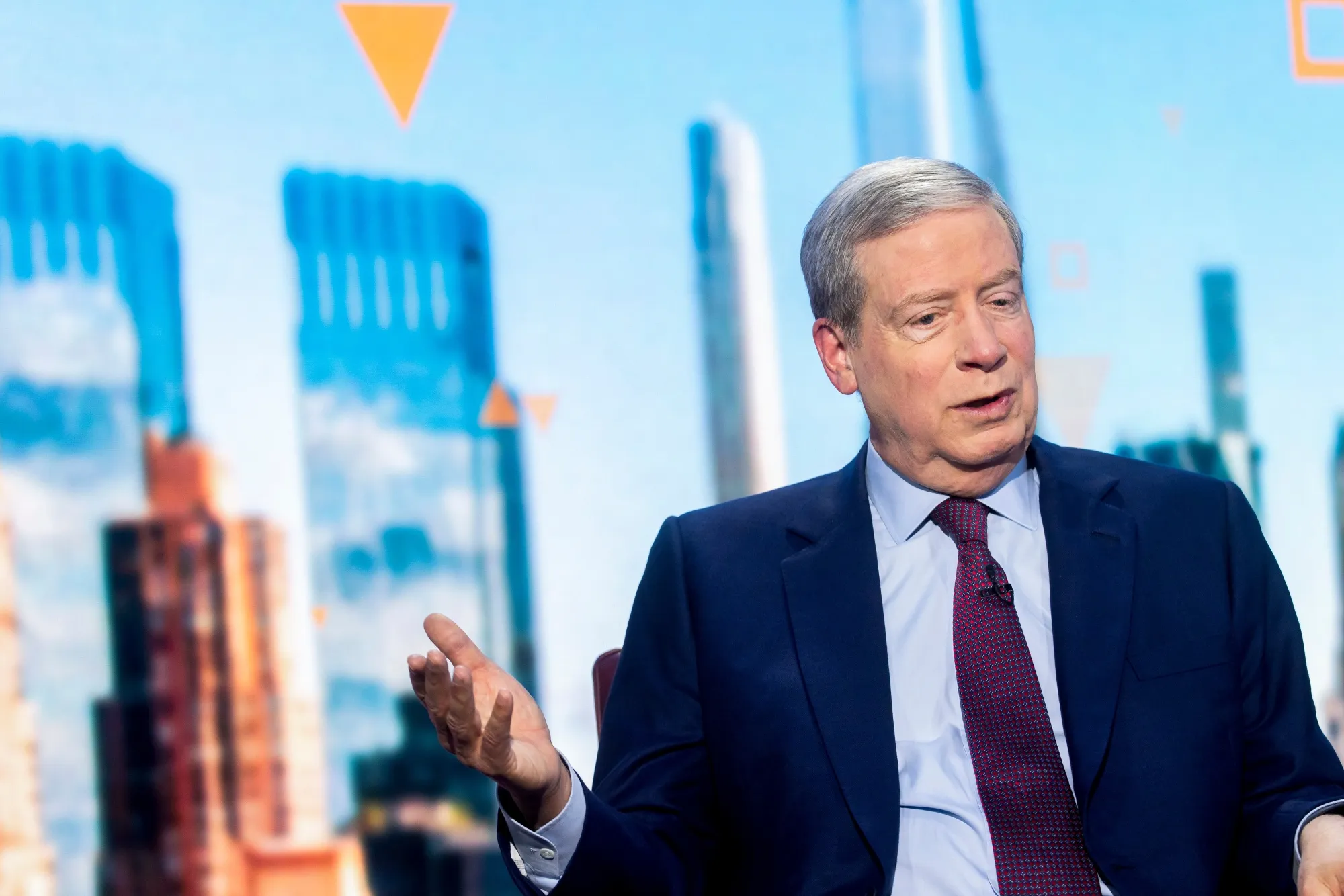 杜肯家族辦公室有限責任公司董事長、首席執行官兼創始人斯坦·德魯肯米勒在美國紐約接受彭博電視台採訪時的畫面。