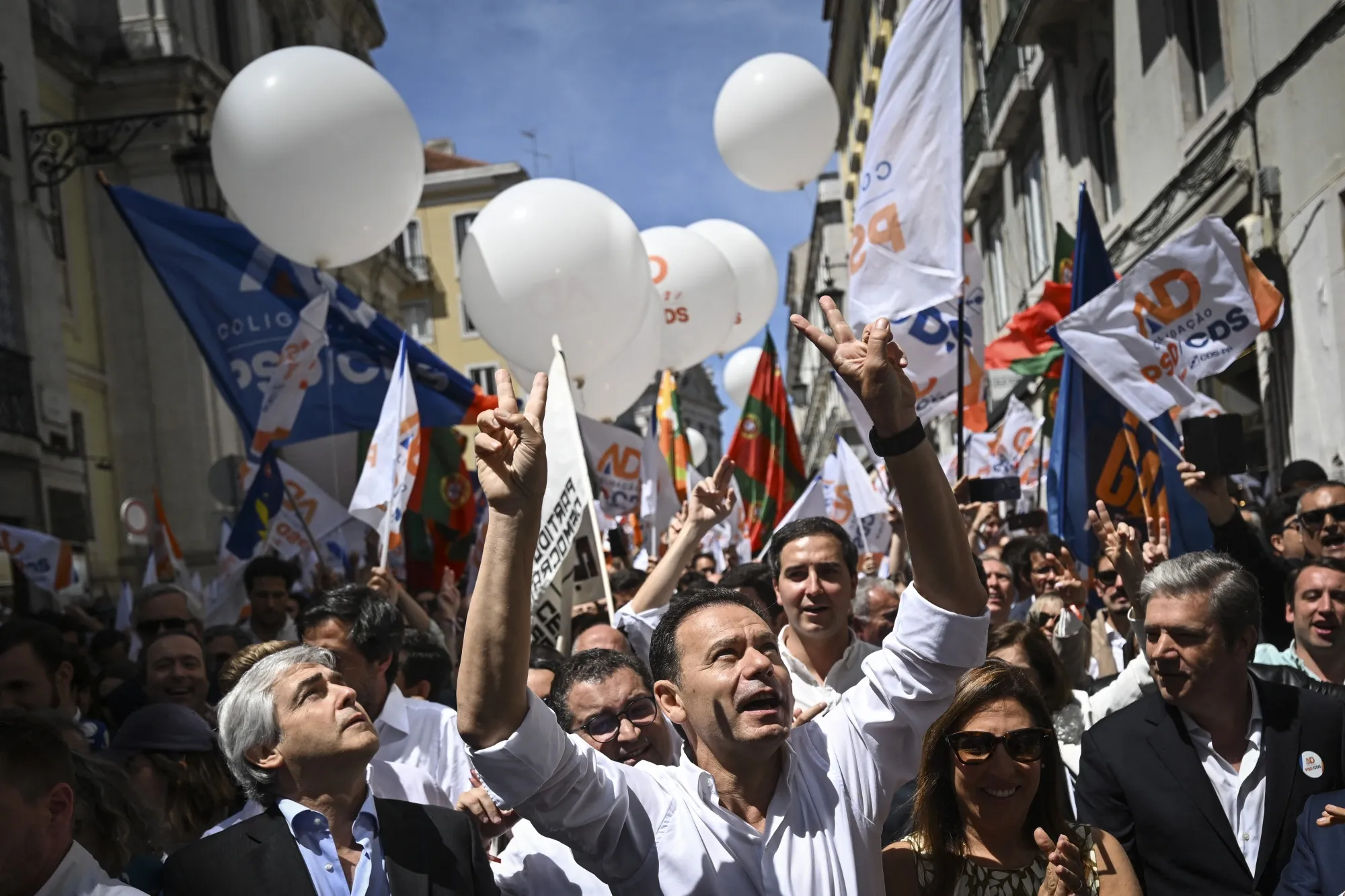 葡萄牙總理路易斯·黑山5月16日參加街頭集會(中)。攝影師:Patricia de Melo Moreira/AFP/Getty Images由於路易斯·黑山總理領導的少數派政府於三月在議會信任投票中失利,葡萄牙將於週日迎來三年內的第三次選舉。