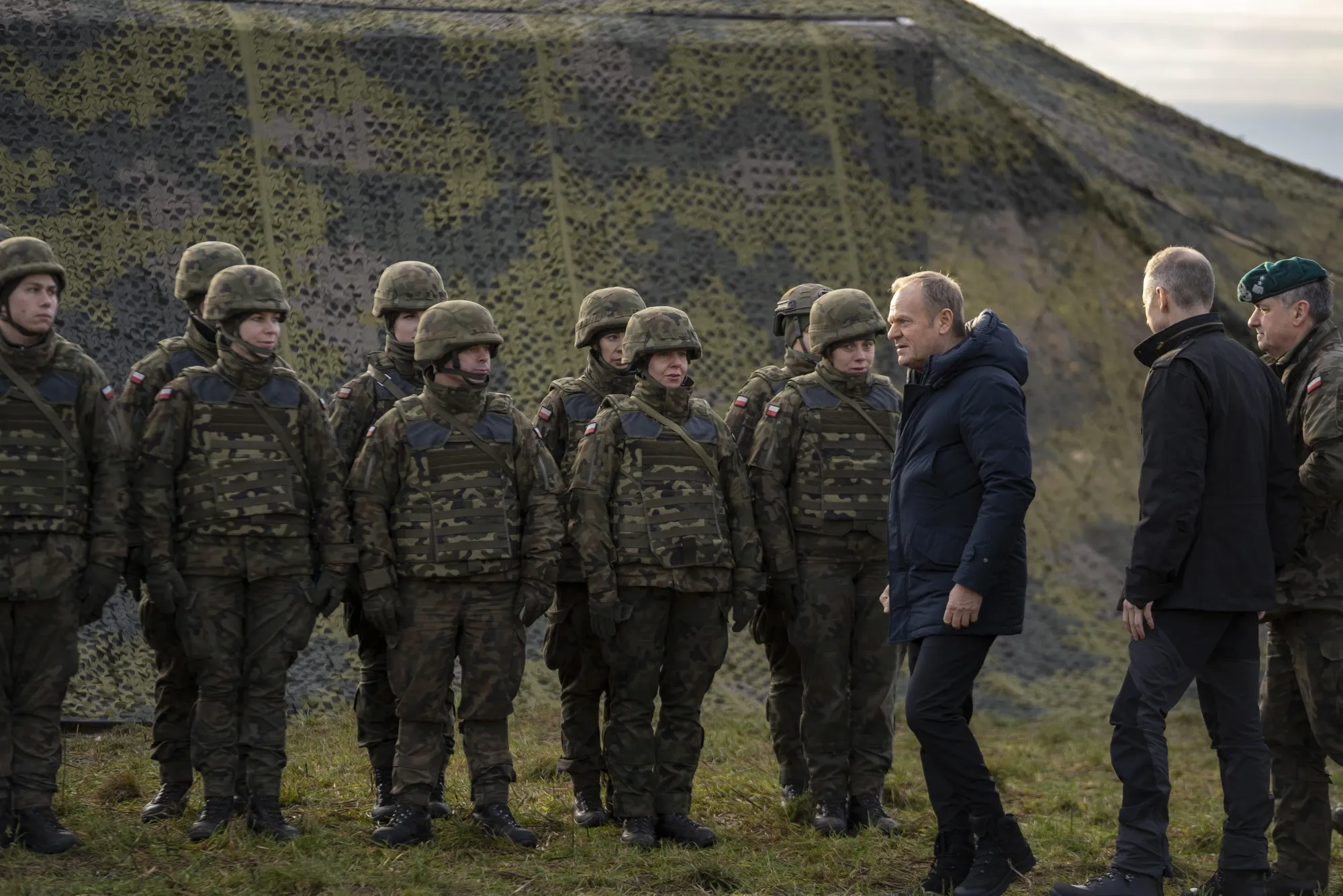 11月30日,唐納德·圖斯克在達布羅夫卡與駐守俄波邊境的波蘭士兵交談。攝影師:達米安·萊曼斯基/彭博社特扎斯科夫斯基的競選綱領聚焦安全與國防領域,主張波蘭應在不損害對美牢固關係的前提下深化與歐洲盟友的紐帶。