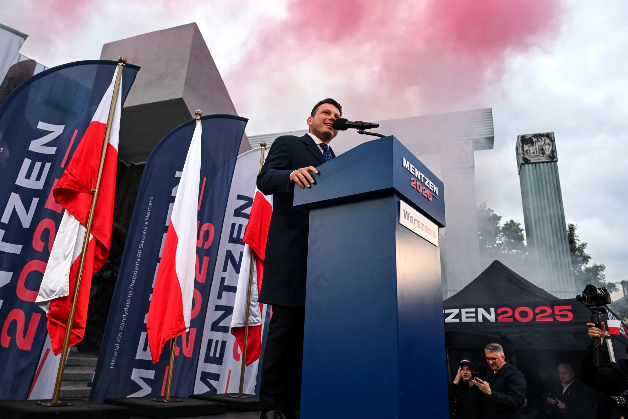 5月10日,斯拉沃米爾·門岑在華沙的競選集會上。攝影師:奧馬爾·馬克斯/蓋蒂圖片社作為聯盟黨的聯合領導人,門岑以政治體制的替代選擇身份參與競選。他承諾削減税收、限制移民並減少對波蘭境內大量烏克蘭難民的支持。