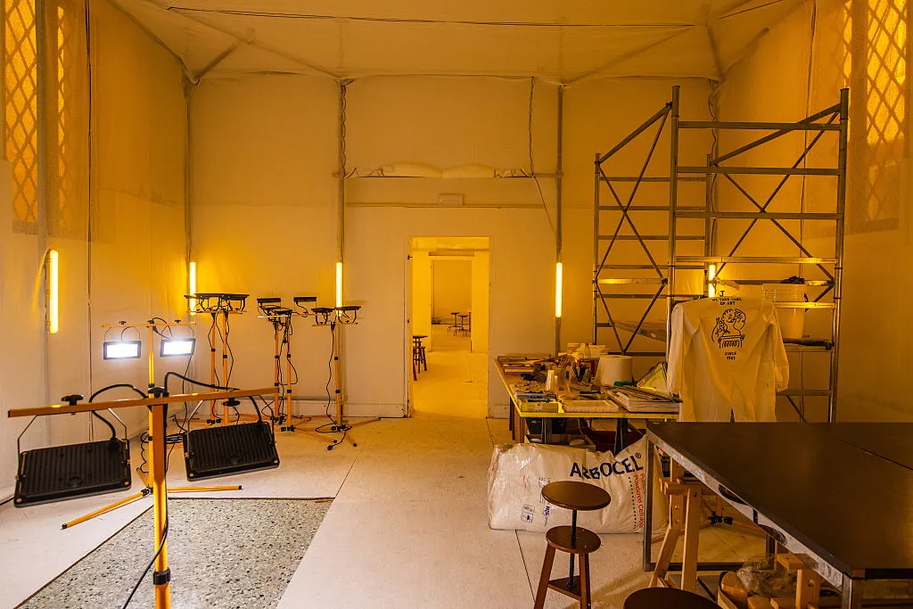 德國展館採取雙軌呈現:一個房間以冷調綠色空間示人,另一個則完整再現了夏季城市熱島的悶熱壓迫感。最觸目驚心的裝置或許來自非國家館的策展單元——由具有氣候意識的德國工程團隊Transsolar打造的無窗倉庫:滿負荷運轉的空調機組被懸空吊掛,無法正常排出室內熱量,旋轉的風扇使空間温度升至難以忍受的程度,無聲控訴着依賴技術應對極端氣候(實則加劇問題或轉嫁他人)的荒謬。