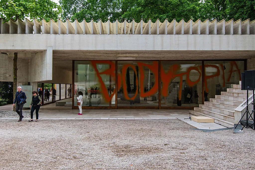 北歐館的一場表演。攝影師:西蒙尼·帕多瓦尼/蓋蒂圖片社歐洲部分參展作品跳脱了非此即彼的框架。尤其引人注目的是幾件探索建築、性別與性意識交匯點的展品。在芬蘭藝術家泰奧·阿拉-魯奧納的北歐館作品中,建築再利用與跨性別身體的隱喻相互映照,將現代主義批判為僵化壓抑的存在。這可能是本屆藝術節最鮮活、最震撼的展陳——配合着週期性的現場表演——儘管其對靈活可變建築未來的構想,與當下無處不在的集裝箱城市主義有着微妙的相似。公園另一端的荷蘭館則構想了一個由LGBTQ羣體設計、為其服務的體育酒吧(劇透:很可能運用大量淡紫色調)。