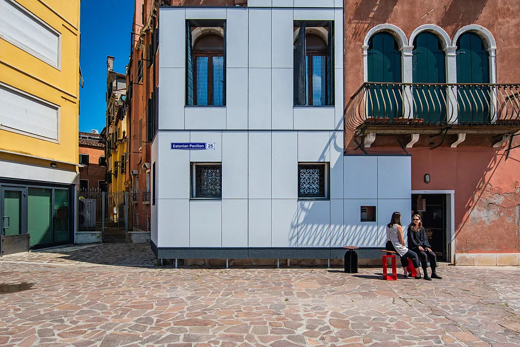 愛沙尼亞館參展方案中,設計師將蘇聯時期公寓樓常見的外牆保温材料移植到威尼斯建築的立面上。攝影師:西蒙尼·帕多瓦尼/蓋蒂圖片社歐洲今年威尼斯建築雙年展的展品選擇呈現出鮮明的"好警察-壞警察"式對立。以"智慧:自然·人工·集體"為主題的展覽,折射出建築界對行業轉型的深刻焦慮——既要應對氣候變化,又要減少建築活動對環境的破壞。參展作品在樂觀的綠色未來構想與猶如博斯畫作般黯淡的末日圖景間劇烈搖擺,後者警示着人類行動失敗可能引發的災難。