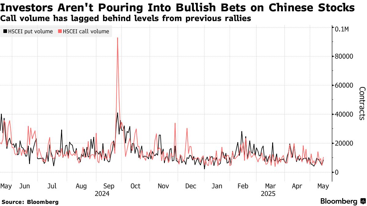 去年市場因刺激政策預期大漲時,追漲的交易員推動中國企業指數期權價格指標飆升。而該指標上週收於1月以來最低水平。