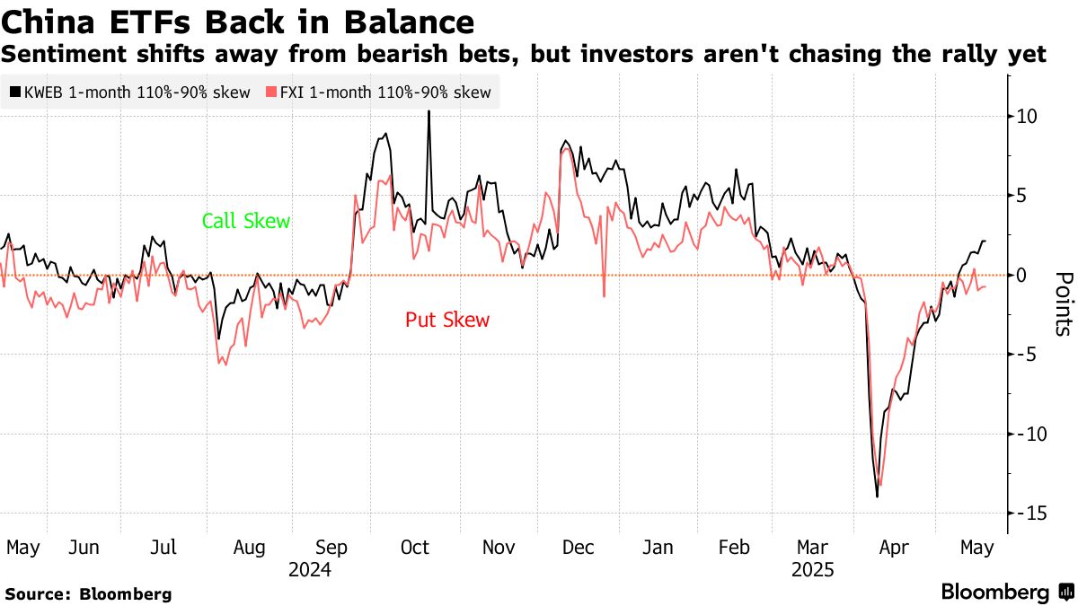 追蹤香港內地股的恒生中國企業指數已從4月低點反彈近17%,而防範下跌的對沖成本在觸及高位後回落至平均水平。在美國,跟蹤中國股市的最大交易所交易基金也呈現類似趨勢。