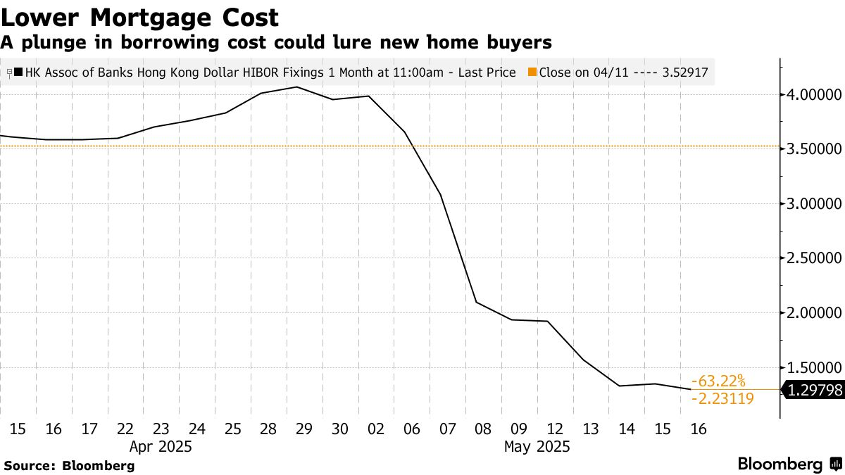 “1個月Hibor暴跌可能使按揭利率進一步低於住宅租金收益率,重燃投資者對香港樓市的興趣,“彭博行業研究分析師Patrick Wong和John Wong在週五報告中指出。他們預計這個亞洲金融中心5月新房成交量將環比4月的1,100套激增36%。