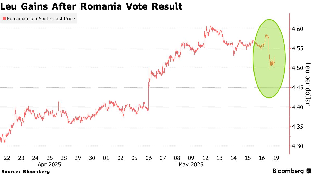 韓國韓元同樣走強,穆迪評級剝奪美國頂級信用評級後,市場對美元情緒受挫。布加勒斯特中間派市長尼庫索爾·丹在總統選舉決勝輪中擊敗極右翼特朗普支持者後,羅馬尼亞貨幣創下近月來最大單日漲幅。
