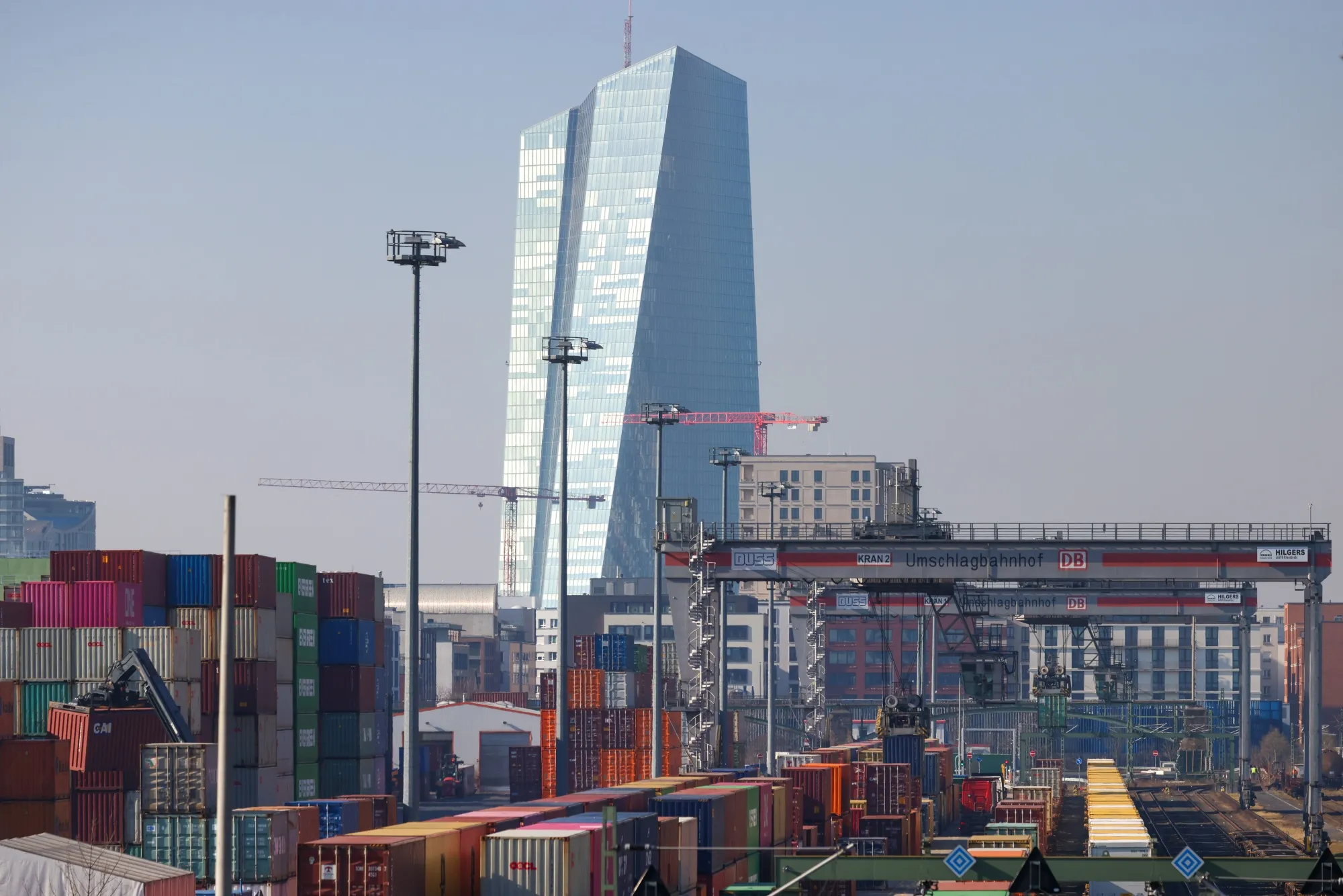法蘭克福貨運碼頭集裝箱堆場後方的歐洲中央銀行總部大樓。攝影師:亞歷克斯·克勞斯/彭博社歐盟委員會表示,受美國貿易政策外溢效應影響,歐元區通脹率明年將跌破歐洲央行目標水平。