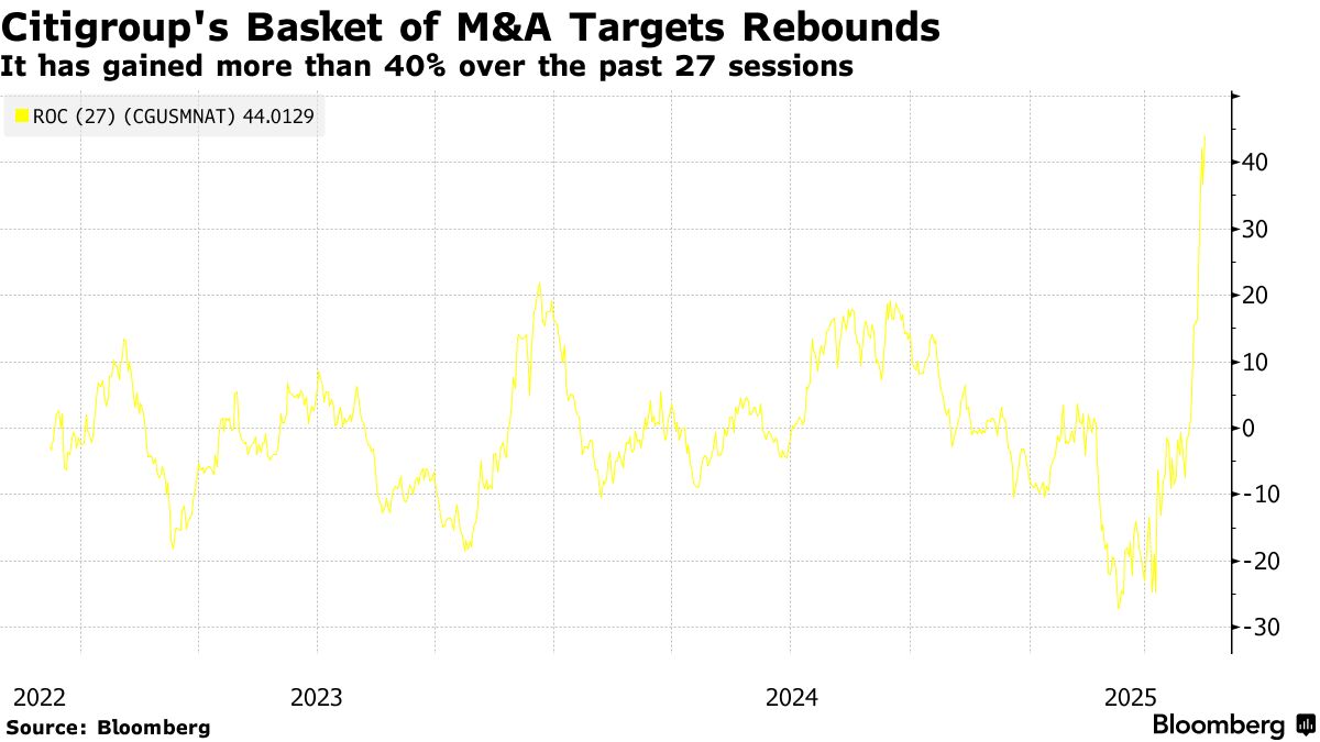 花旗集團列為收購目標的一批美國股票正大幅上漲,凸顯華爾街對隨着關税擔憂緩解、併購活動將隨經濟復甦而重燃的新一輪樂觀情緒。