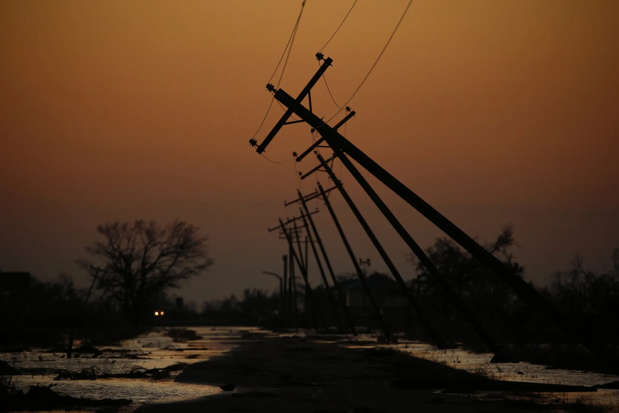 2020年颶風"德爾塔"登陸路易斯安那州後損毀的電線杆。
