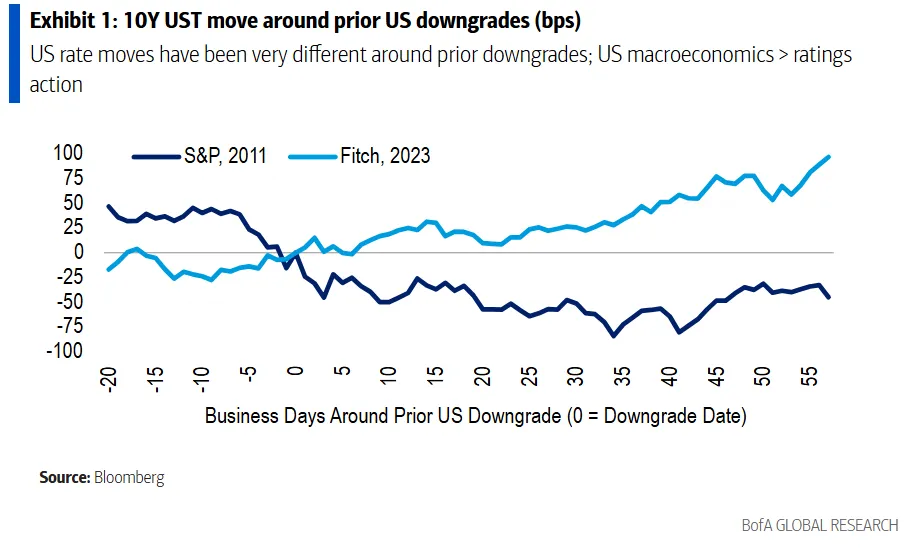 該圖展示了美國主權評級前兩次遭下調後10年期國債收益率的走勢,分別是2011年標普500和2023年惠譽的降級行動。正如美銀指出,市場反應並不一致:有時收益率因投資者拋售債券而上升,有時卻因投資者尋求債券避險而下降(這種對債券安全性下降的本能反應常被指出頗具諷刺意味)。情況大相徑庭,一切取決於具體環境。用個蹩腳的比喻:若美國信用評級在無人關注債務軌跡的市場叢林中墜落,確實影響甚微;但若降級發生在投資者正警惕美債安全性、傾聽預警信號的市場叢林中,則會產生實質衝擊。