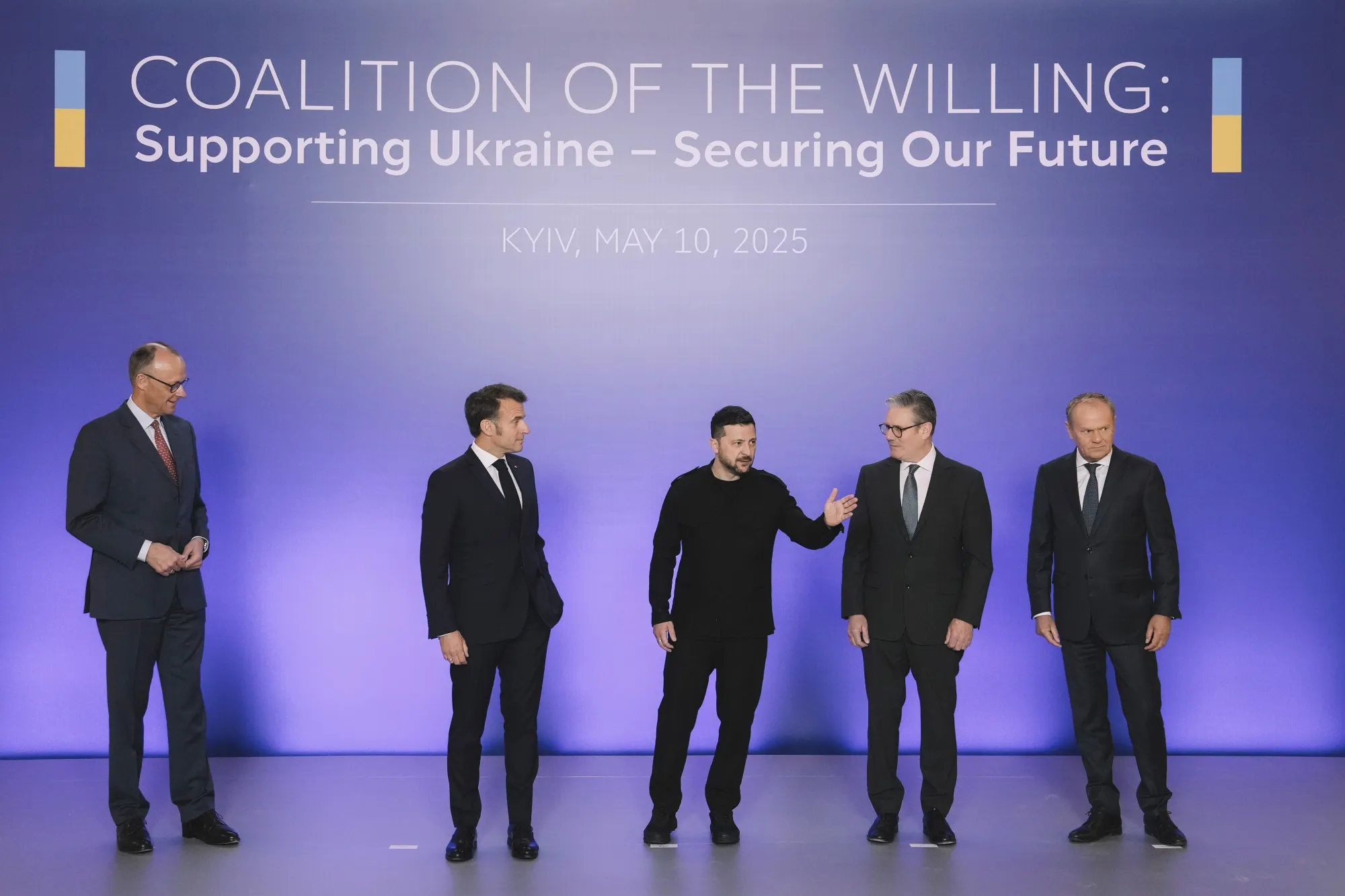 從左至右:弗里德里希·默茨、埃馬紐埃爾·馬克龍、弗拉基米爾·澤連斯基、基爾·斯塔默和唐納德·圖斯克在基輔。攝影師:安德魯·克拉夫琴科/彭博社### 波蘭總統兩位候選人的競選主張聚焦哪些議題?