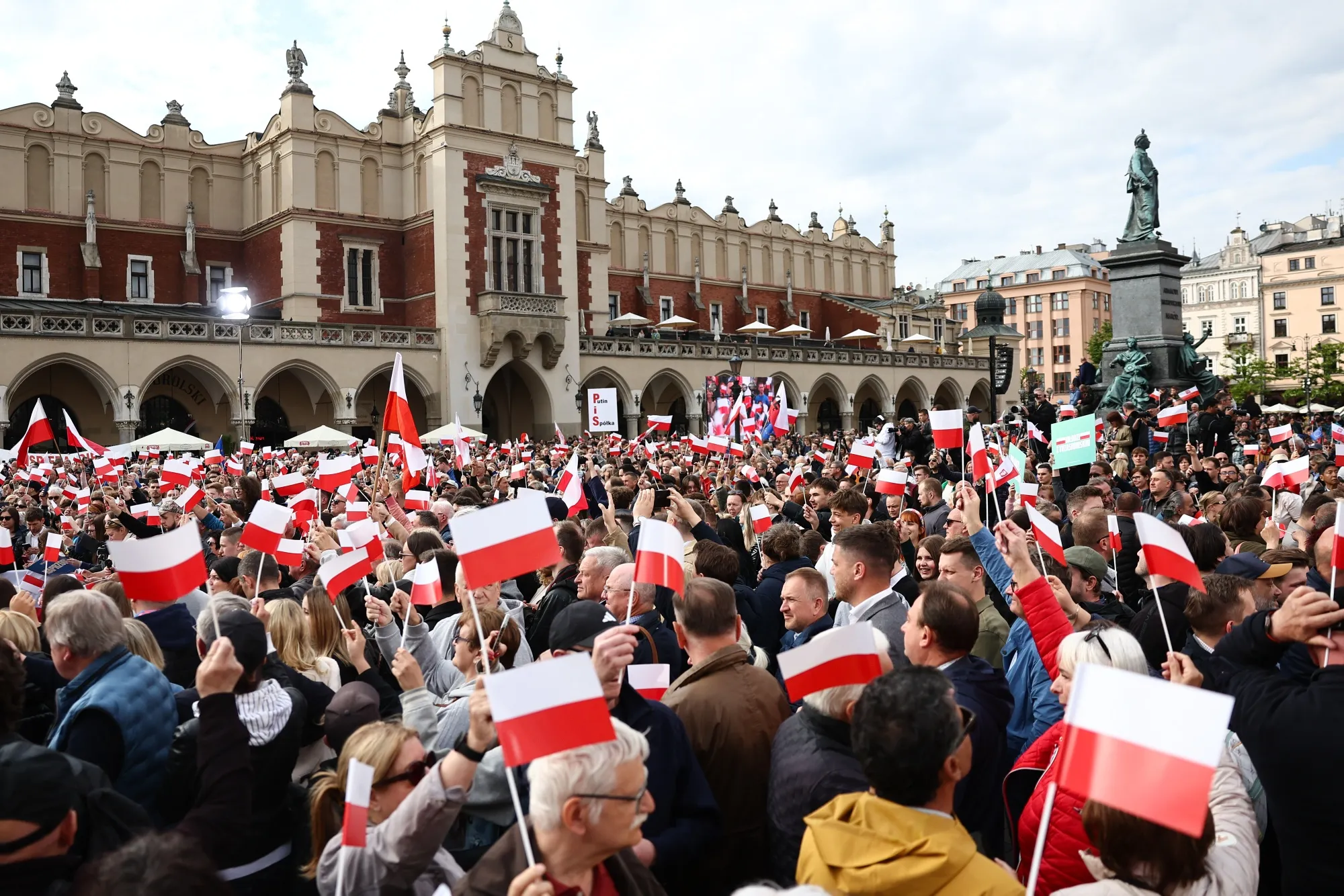 2025年5月13日,波蘭克拉科夫主廣場選舉集會上拉法爾·特扎斯科夫斯基的支持者們。攝影師:雅庫布·波爾日茨基/阿納多盧/蓋蒂圖片社波蘭總統選舉將決定該國在經歷近十年分裂性右翼民粹主義統治後,能否恢復法治並繼續作為歐盟可靠夥伴。