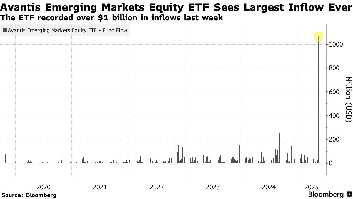 上週,規模達97億美元的Avantis新興市場股票ETF錄得逾10億美元資金流入,創下該基金有史以來最大單週資金流入紀錄。根據彭博彙編的數據,這佔到了投資於發展中國家的美國上市新興市場ETF資金流入總量的一半以上。
