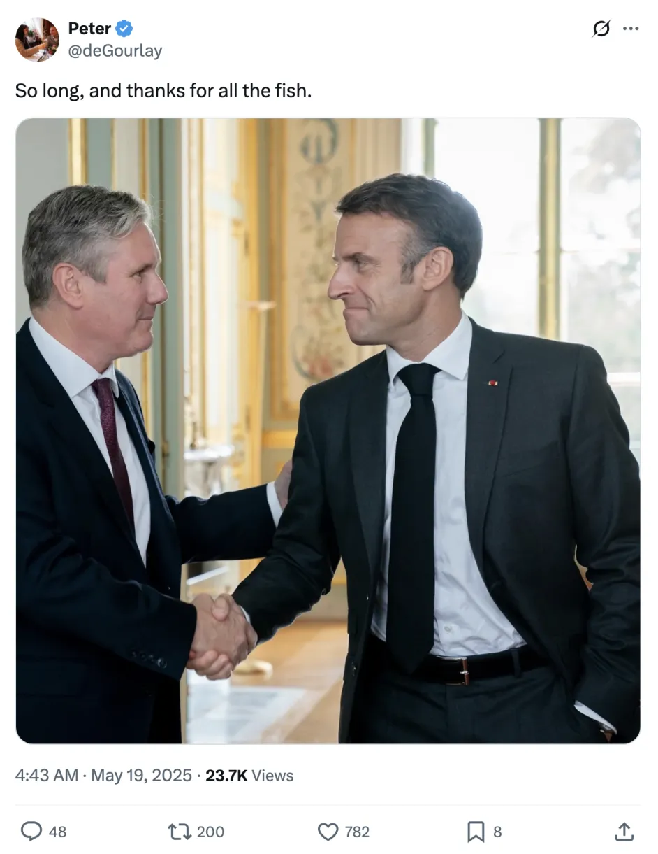 尚不清楚斯塔默在捕魚權問題上的最後一刻讓步是否會影響卡米拉王后鍾愛的炸魚薯條下午茶,但萊昂內爾認為"英國與歐盟痛苦分裂的傷痕需要比一次峯會更長的時間來癒合”。