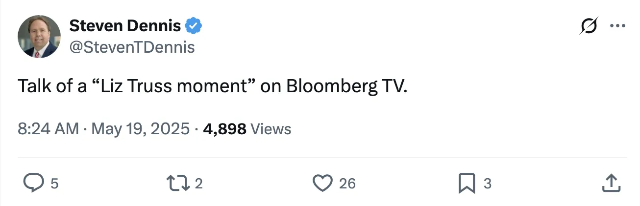 這就是為什麼人們正在警示可能出現"莉茲·特拉斯時刻”。若您記得,特拉斯——其政治生涯壽命不及一顆生菜而聞名——在2022年瘋狂推行減税政策卻未能通過削減開支來平衡。布隆伯格警告,若特朗普政府重蹈覆轍,“納税人——以及國家的經濟實力與穩定——將承擔後果”。
