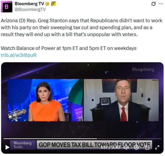今天下午1點,彭博電視台的權力平衡早間節目中,主持人喬·馬修和凱莉·萊因茨採訪了亞利桑那州民主黨眾議員格雷格·斯坦頓,討論其政黨對共和黨減税法案的反對。