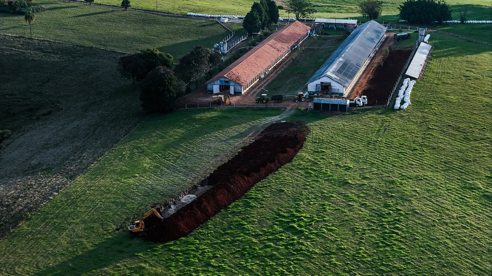 在巴西南里奧格蘭德州蒙特內格羅市,一台挖掘機正在商業養殖場挖掘溝渠掩埋感染禽流感的家禽,該農場上週暴發了禽流感疫情。