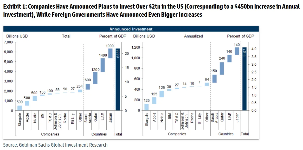 特朗普一直在吹捧美國重大投資公告,以此證明其關税、税收和放松管制政策的成效。高盛研究了是否真的會出現投資激增——如果表面數據可信,這些計劃似乎暗示着這一點。