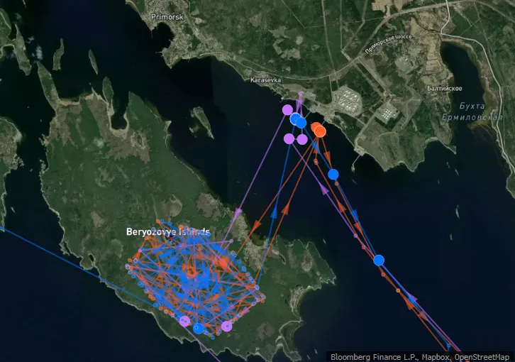 在5月的前18天,在普里莫爾斯克裝載的20艘油輪中有16艘發送瞭如下圖所示的信號,顯示它們位於普里莫爾斯克附近最大的別廖佐維耶羣島中間。這些信號模式看起來過於相似和頻繁,不可能是無意的。