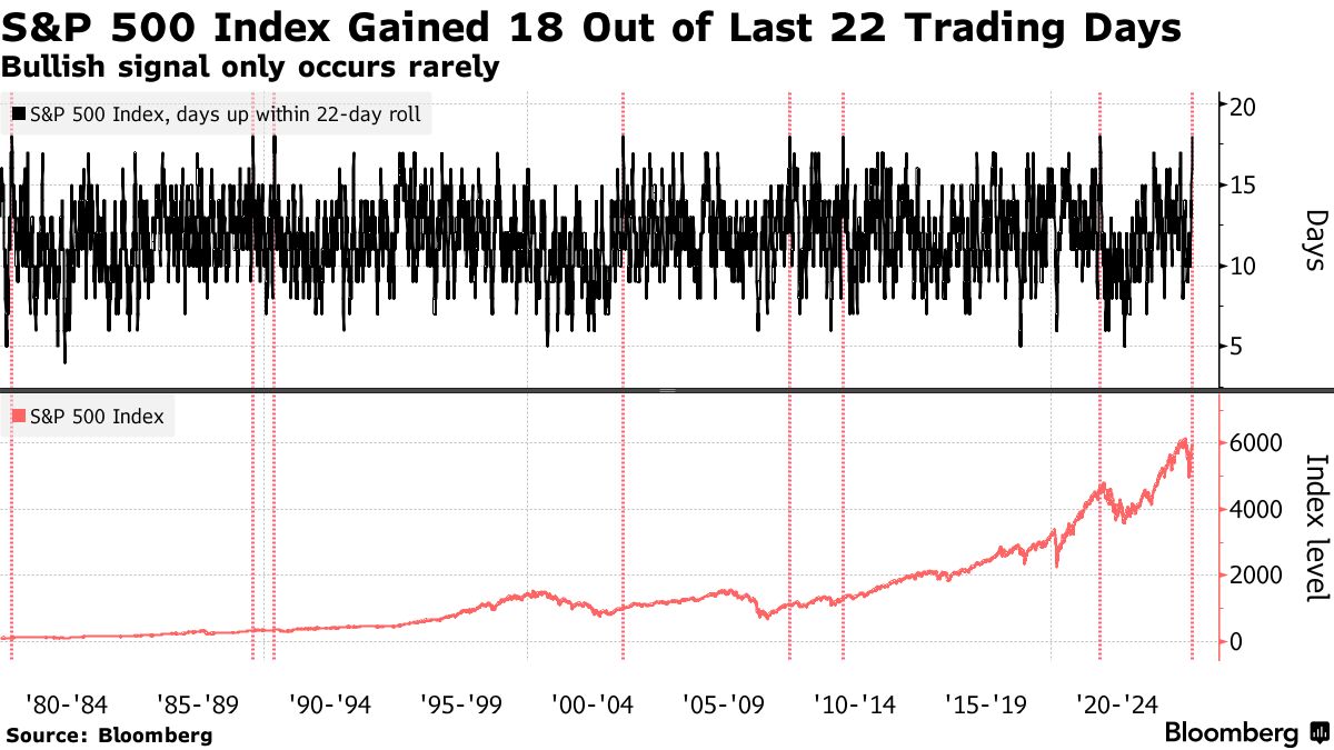 標普500指數正處於歷史性的連勝行情中,上月隨着白宮發動全球貿易戰,該指數經歷了新冠疫情爆發以來最劇烈的下跌。這個美國股市基準指數在過去22個交易日中有18天上漲,這是自1980年以來的第八次,通常出現在熊市復甦階段。