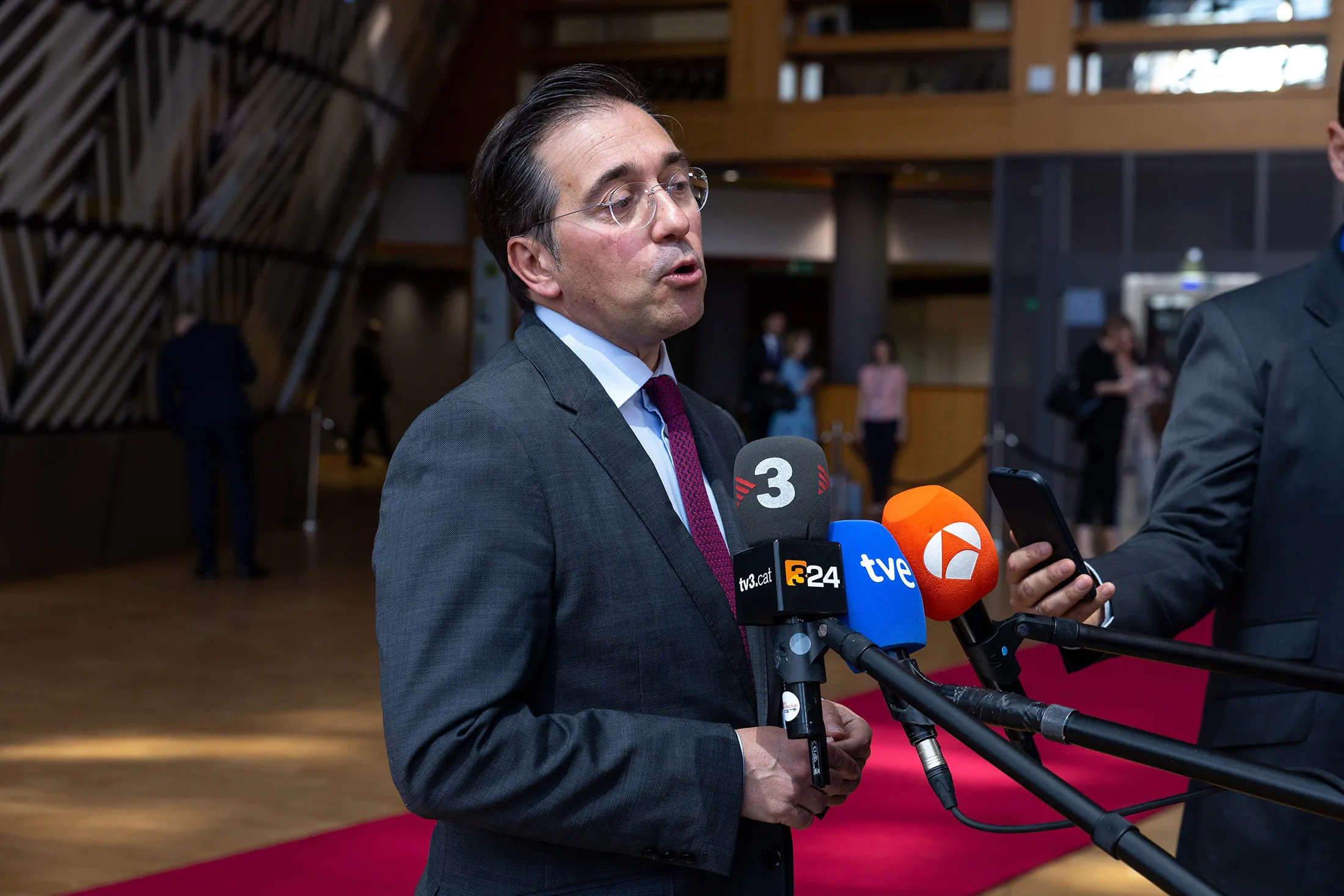 5月20日,西班牙外交部長何塞·曼努埃爾·阿爾巴雷斯在比利時布魯塞爾的歐盟理事會總部向媒體發表講話。