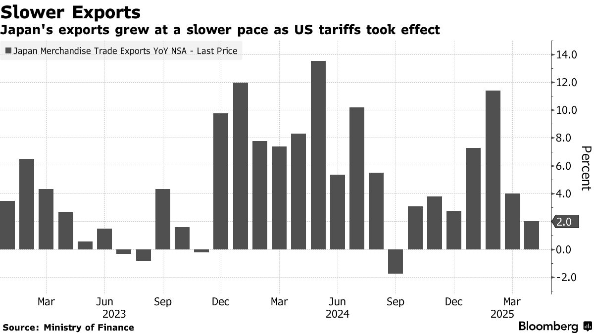 隨着美國加徵關税措施的實施,日本出口增長放緩,凸顯出該國經濟在關税措施正式生效前已出現萎縮後所面臨的風險。