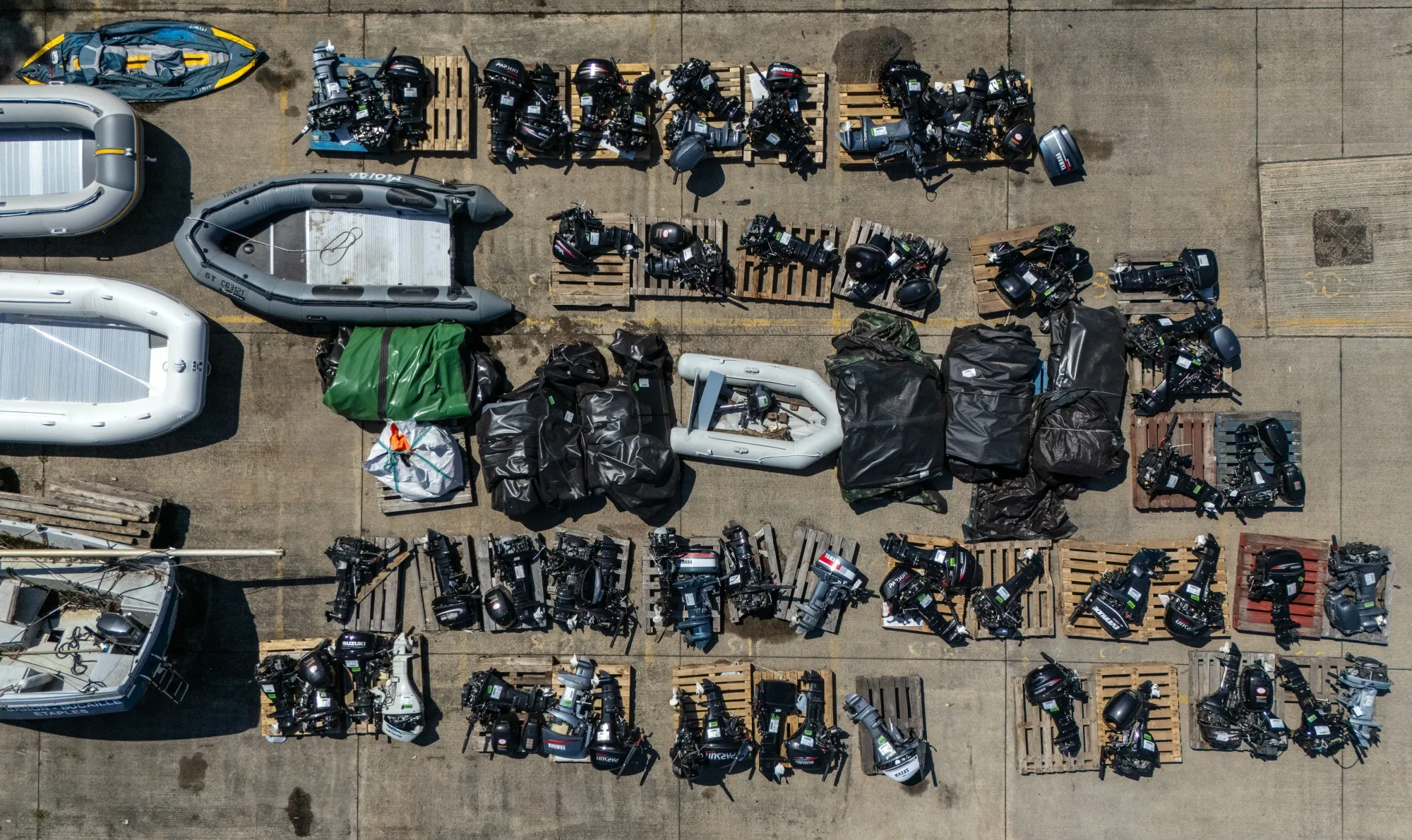 多佛港存放着被認為被非法移民用於橫渡英吉利海峽前往英國的充氣艇和舷外發動機。攝影師:卡爾·考特/蓋蒂圖片社