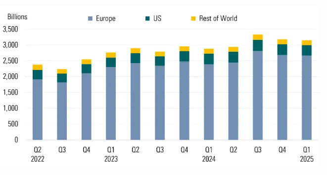 全球範圍內,可持續基金遭遇約86億美元的資金外流。這與上一季度181億美元的淨流入形成鮮明對比。美國已連續十個季度出現資金撤離,總額達61億美元。但對ESG領域而言,歐洲市場更為關鍵。晨星這張圖表追蹤了2022年以來的資金流動情況: