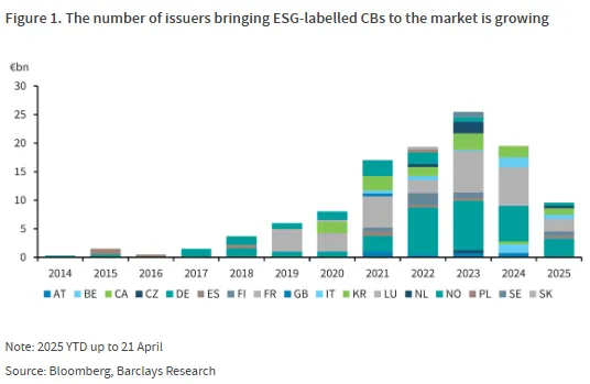 以上討論均針對股票市場。歐洲對綠色債券的需求依然旺盛。發行規模及允許發行此類債券的司法管轄區數量持續增長。巴克萊銀行分析師克里斯蒂娜·科斯塔的研究顯示,來自17個司法管轄區的52家發行方已發行ESG債券,未償餘額現已突破1000億歐元(約合1130億美元)。今年新增一家發行方,僅四個月的發行量就已輕鬆超越2019年全年總量: