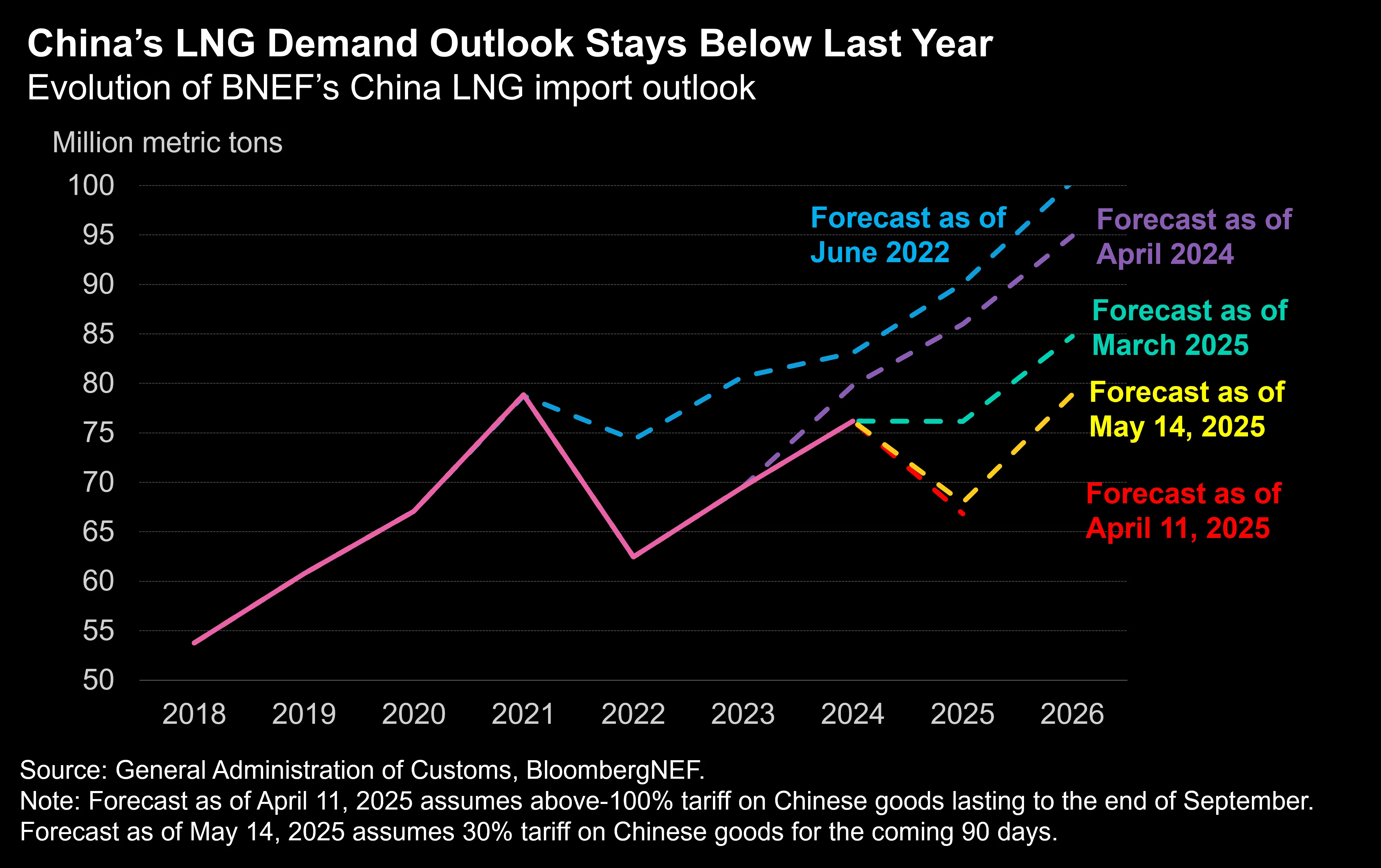 2025年中國天然氣進口量出現下降,其中海運液化天然氣(LNG)降幅尤為顯著,截至4月同比下滑22%。就在美國頁岩氣田主導的新出口項目即將投產之際,LNG需求正面臨疫情高峯以來的首次年度下滑。