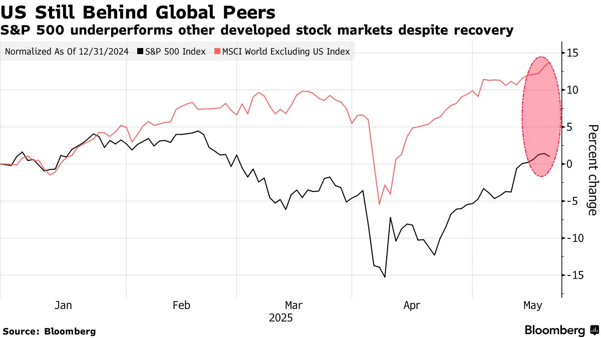 雖然美股從特朗普政府貿易問題的温和表態中獲益——特別是與中國的臨時休戰——但其回升至加税前高點的步伐仍落後於其他全球主要市場。標普500指數仍較2月19日創下的紀錄低約3%,而明晟全球(除美國)指數週二已創新高。