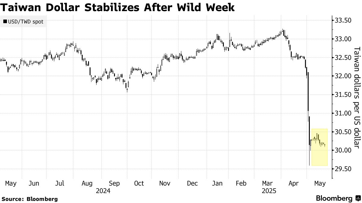 由於出口商急於拋售美元,加之市場認為當局可能允許新台幣升值以促成與美國達成貿易協議,新台幣此前大幅上漲。亞洲最大美債持有者之一的壽險公司為對沖其以美元計價的外匯部位(佔其逾23萬億新台幣外匯資產的大部分)可能進一步加劇了這一漲勢。