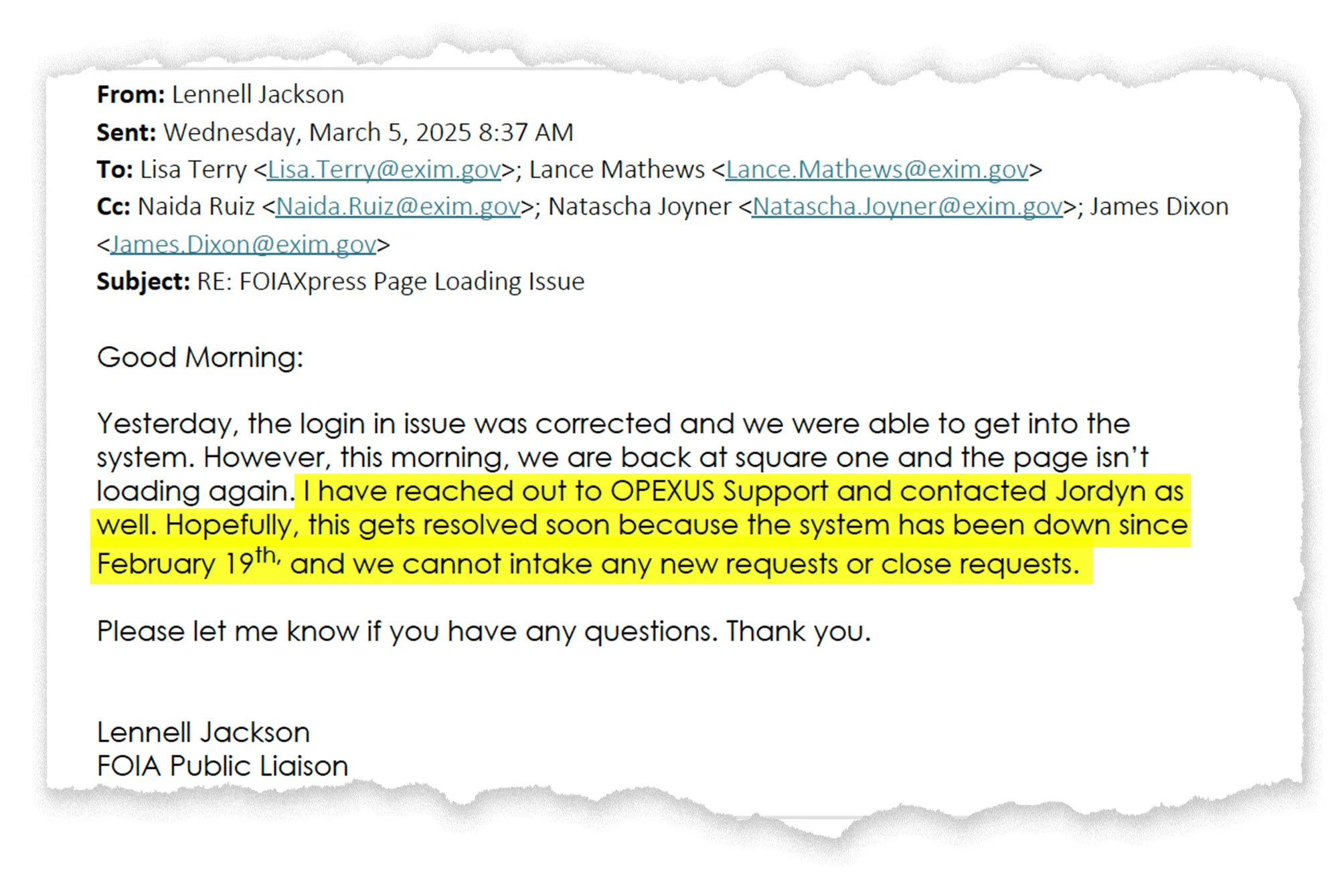 點擊此處閲讀文件(第1頁)文件 我根據《信息自由法》要求從美國進出口銀行獲取的這些文件,清楚展示了系統中斷如何嚴重破壞該機構的《信息自由法》處理工作。