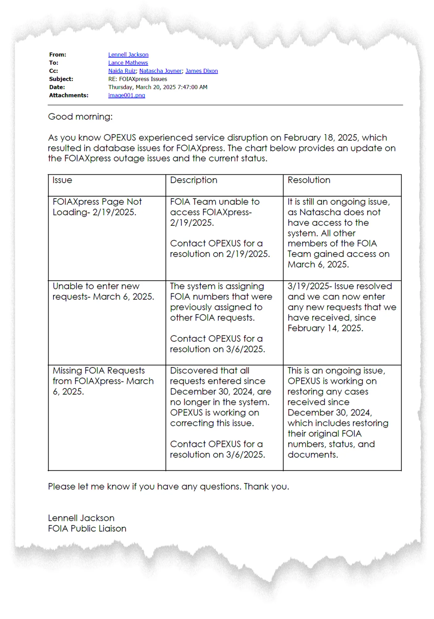 點擊此處閲讀文件(第2頁) 與此同時,美國環保署已更新其《信息自由法》門户網站頂部的通知。上週末其聲明稱:“因FOIAXpress/Opexus數據故障刪除的大部分請求已恢復。如果您在此期間提交過請求或申訴但未收到環保署的接收確認,請重新提交。”