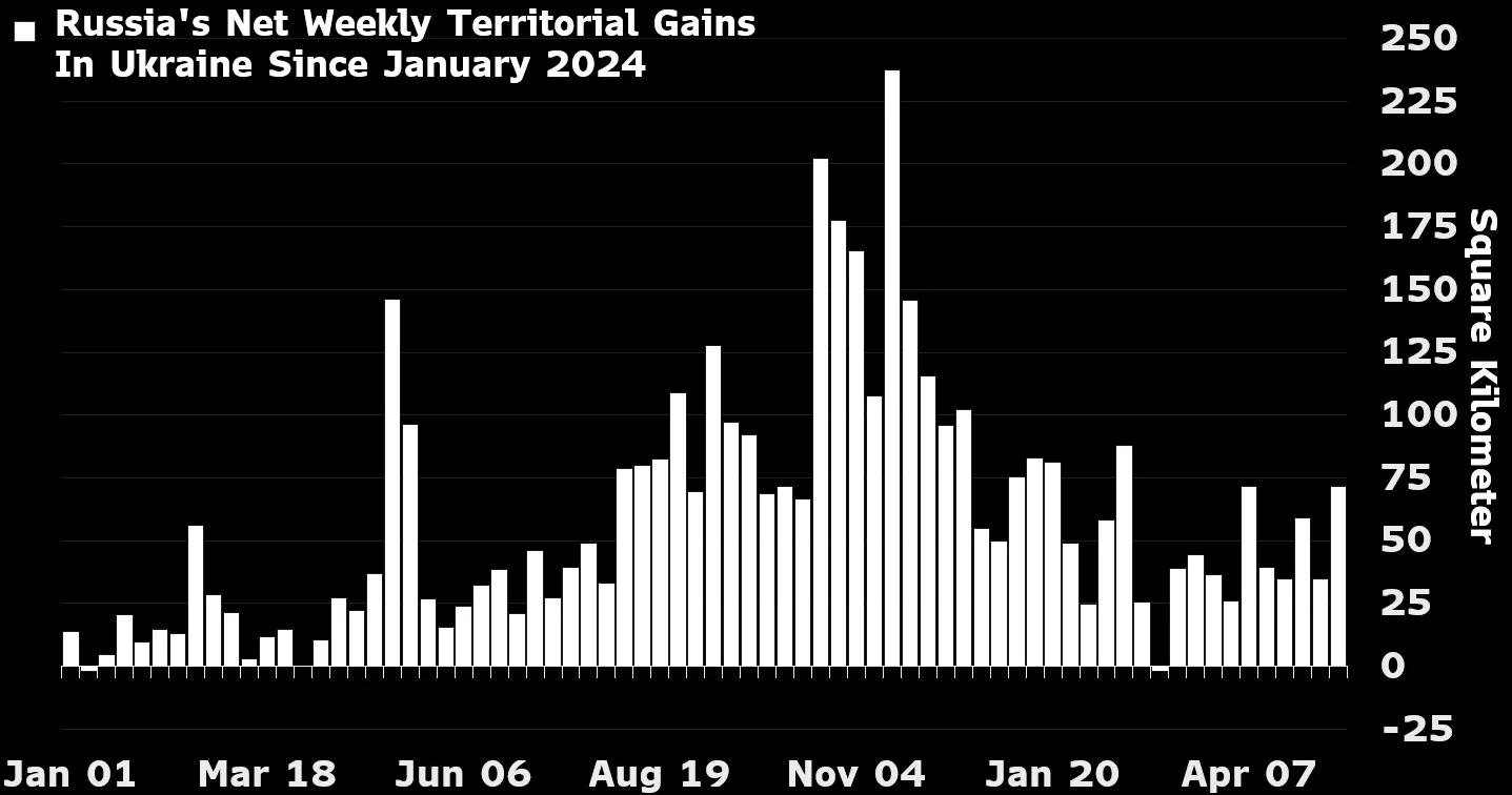 彭博社追蹤的數據顯示,俄羅斯軍隊平均向烏克蘭領土推進速度已降至每週約41平方公里(16平方英里),較去年8月中旬至年底期間平均每週125平方公里的推進速度顯著放緩。