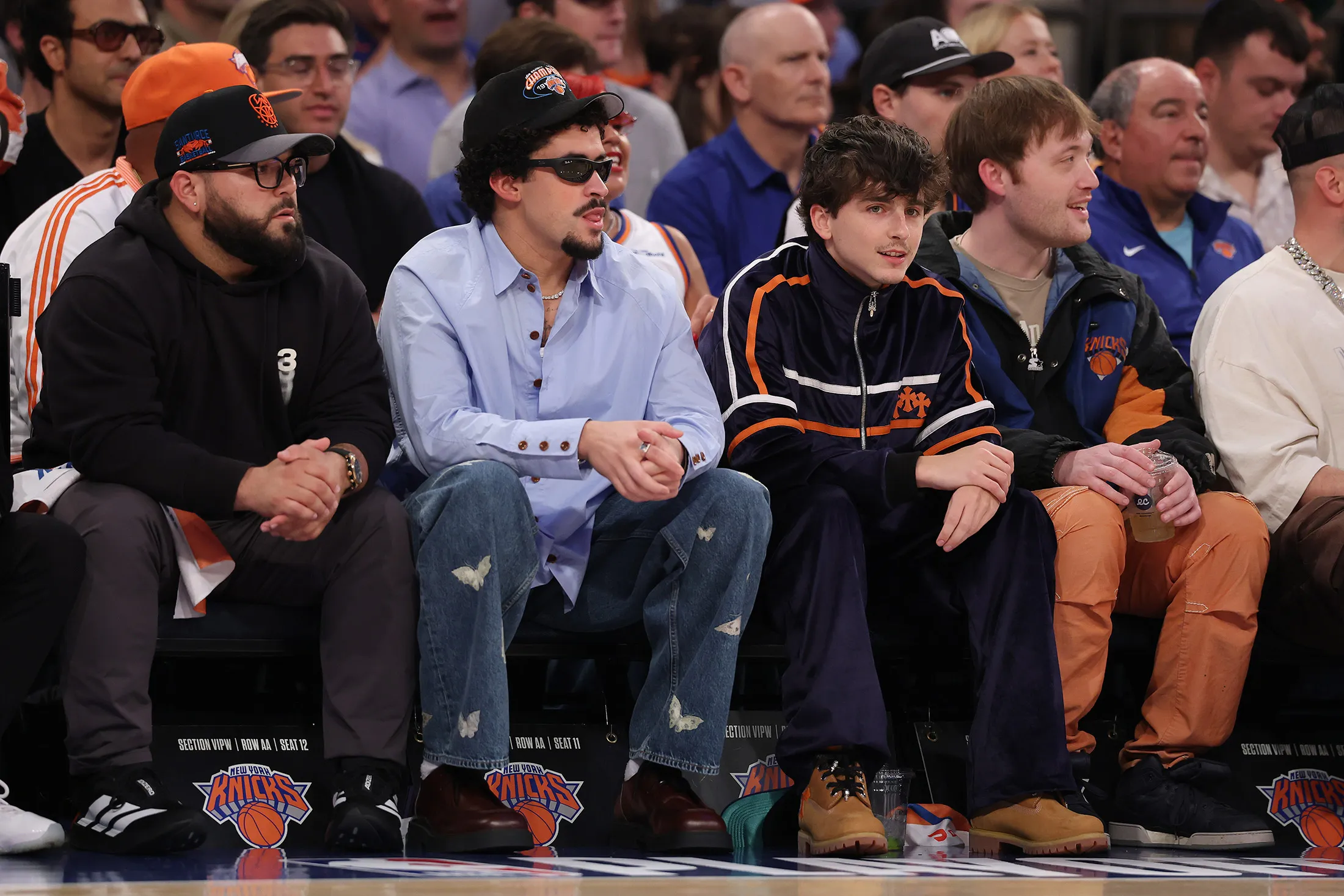 壞痞兔(中)與提莫西·查拉梅(其左側)在麥迪遜廣場花園觀看尼克斯對陣凱爾特人的第六場比賽。攝影師:阿爾·貝洛/蓋蒂圖片社紐約尼克斯隊25年來首次闖入NBA分區決賽,引發的狂熱使得麥迪遜廣場花園的球票價格飆升。