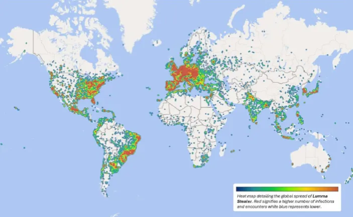 詳細展示Lumma惡意軟件在全球Windows設備上傳播與感染情況的熱力圖。