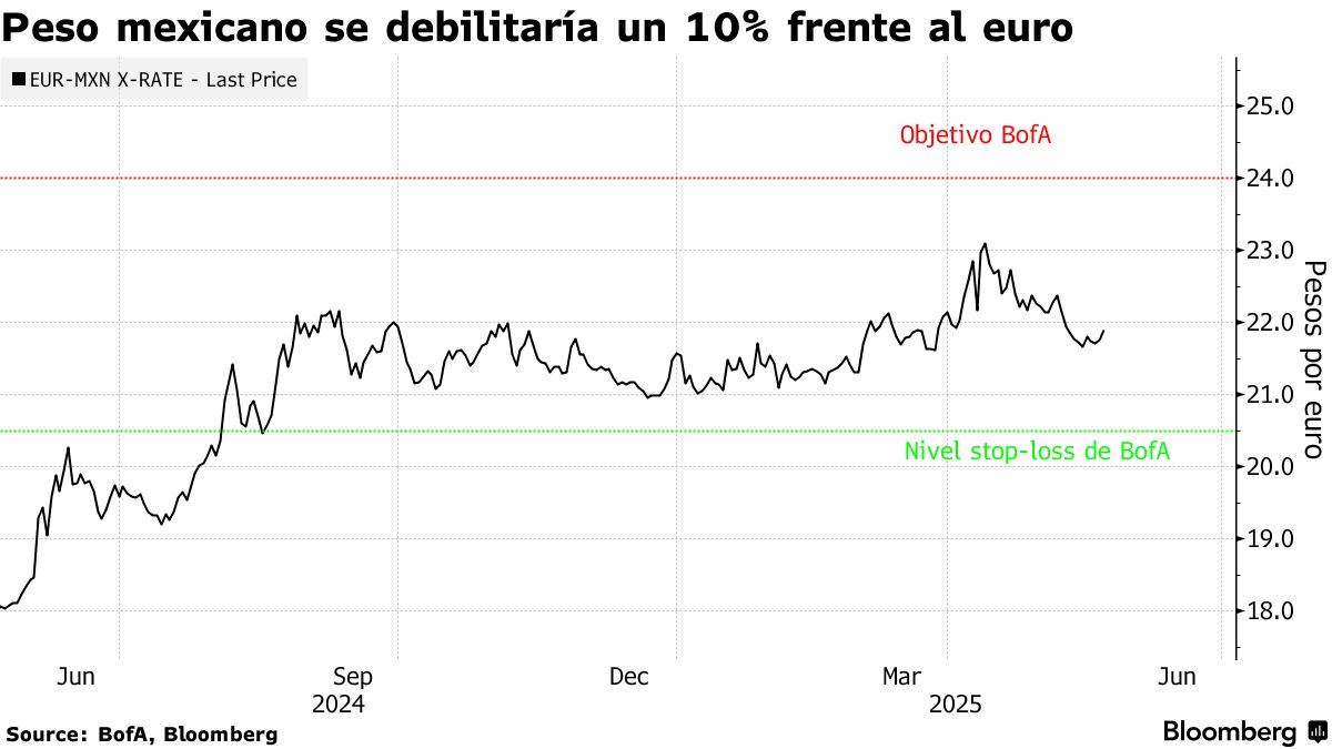 美國銀行策略師開始推薦做空歐元/墨西哥比索,目標價24.0,止損位20.5。週二該匯率收於21.75。