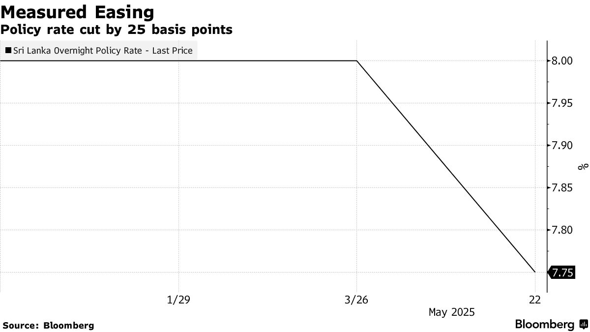 斯里蘭卡央行於5月22日將隔夜政策利率下調25個基點至7.75%。彭博調查的經濟學家中無人預見到這一舉措。