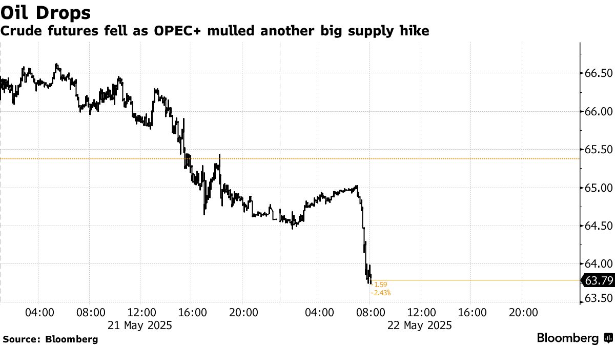 該卡特爾組織自宣佈5月和6月每日增產41.1萬桶(約佔歐佩克+當前產量的1%)以來,已助推原油價格下跌,此舉打破了多年來捍衞石油市場的傳統。週四油價再度下挫,倫敦時間上午8:02下跌1.7%至每桶63.81美元。