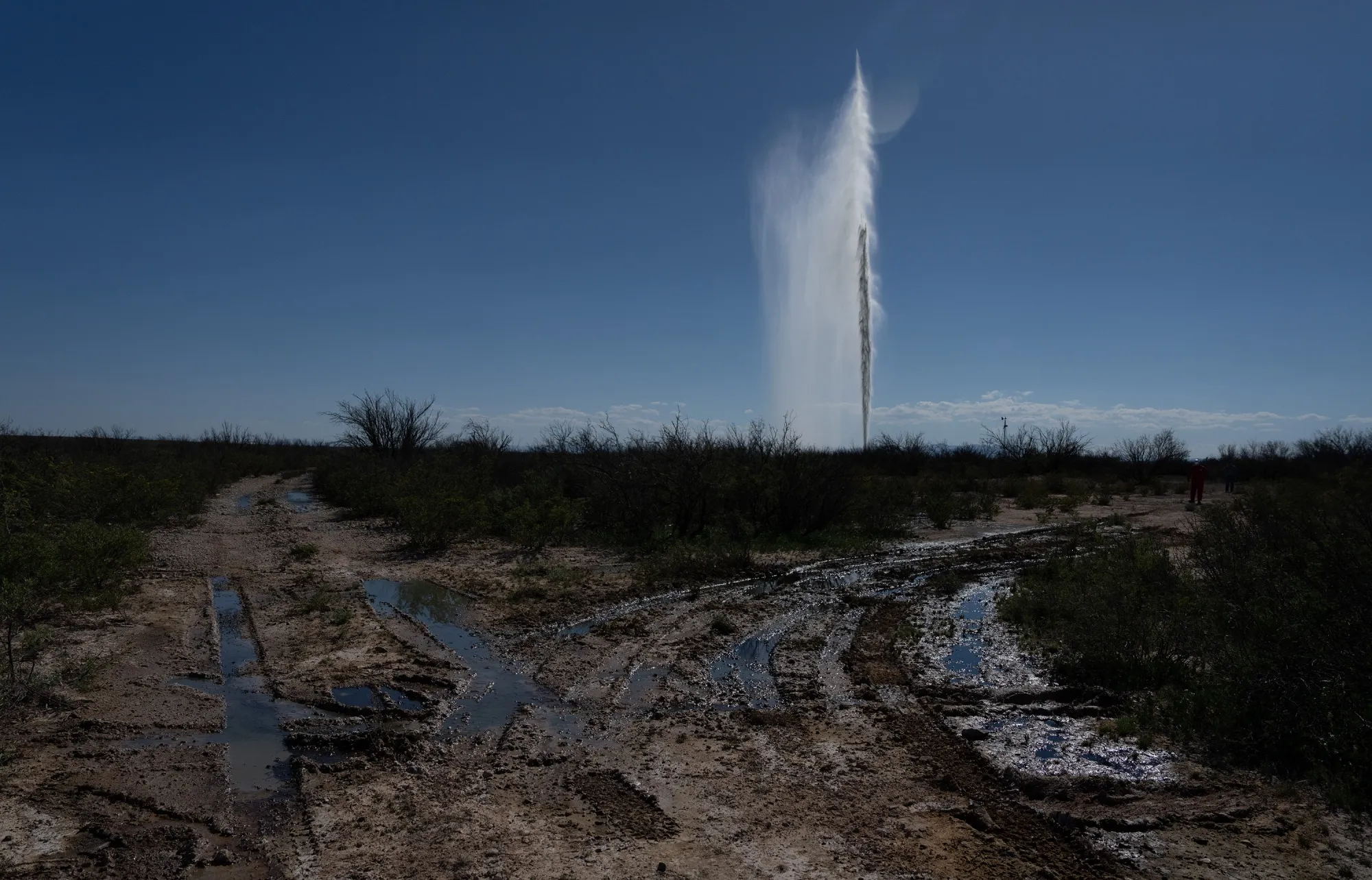 2024年10月2日星期三,美國德克薩斯州託亞地區,採油廢水從地下如間歇泉般噴湧而出。