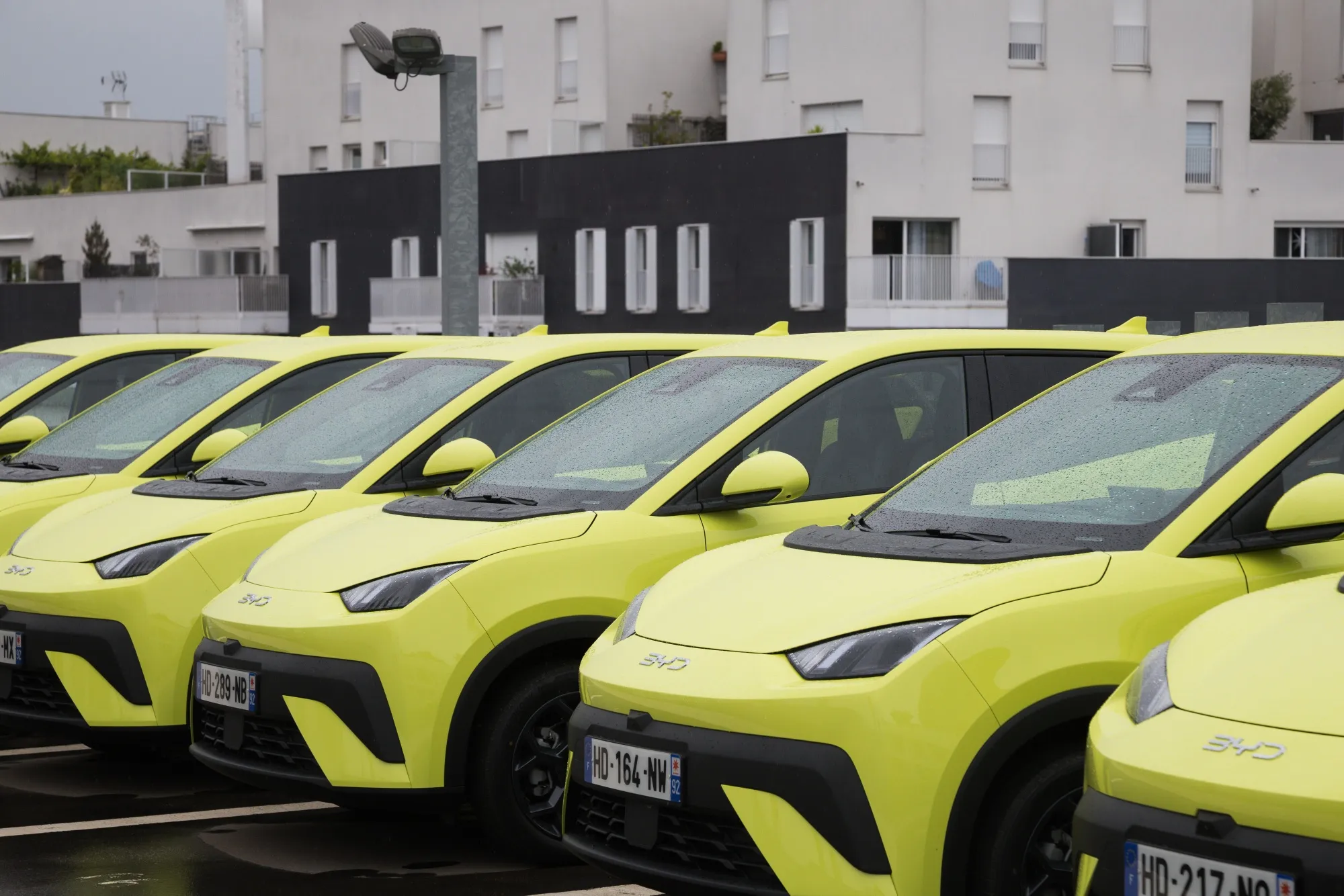 比亞迪海豚電動車型在5月21日巴黎新車發佈會現場。攝影師:Cyril Marcilhacy/彭博社比亞迪在歐洲市場首次超越長期領跑的特斯拉,成為電動車銷量冠軍。